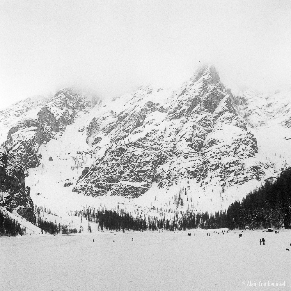 Another view of Lago die Braies, the completely frozen lake has become a playground.